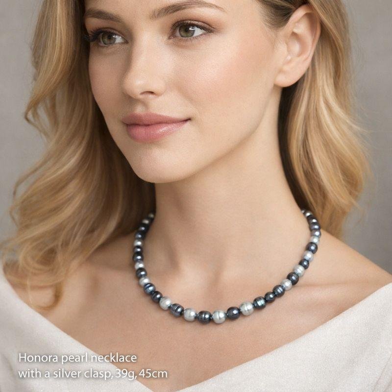 A beautiful Honora freshwater pearl necklace featuring a harmonious mix of silver, grey and peacock-toned pearls , each displaying natural lustre and iridescence.