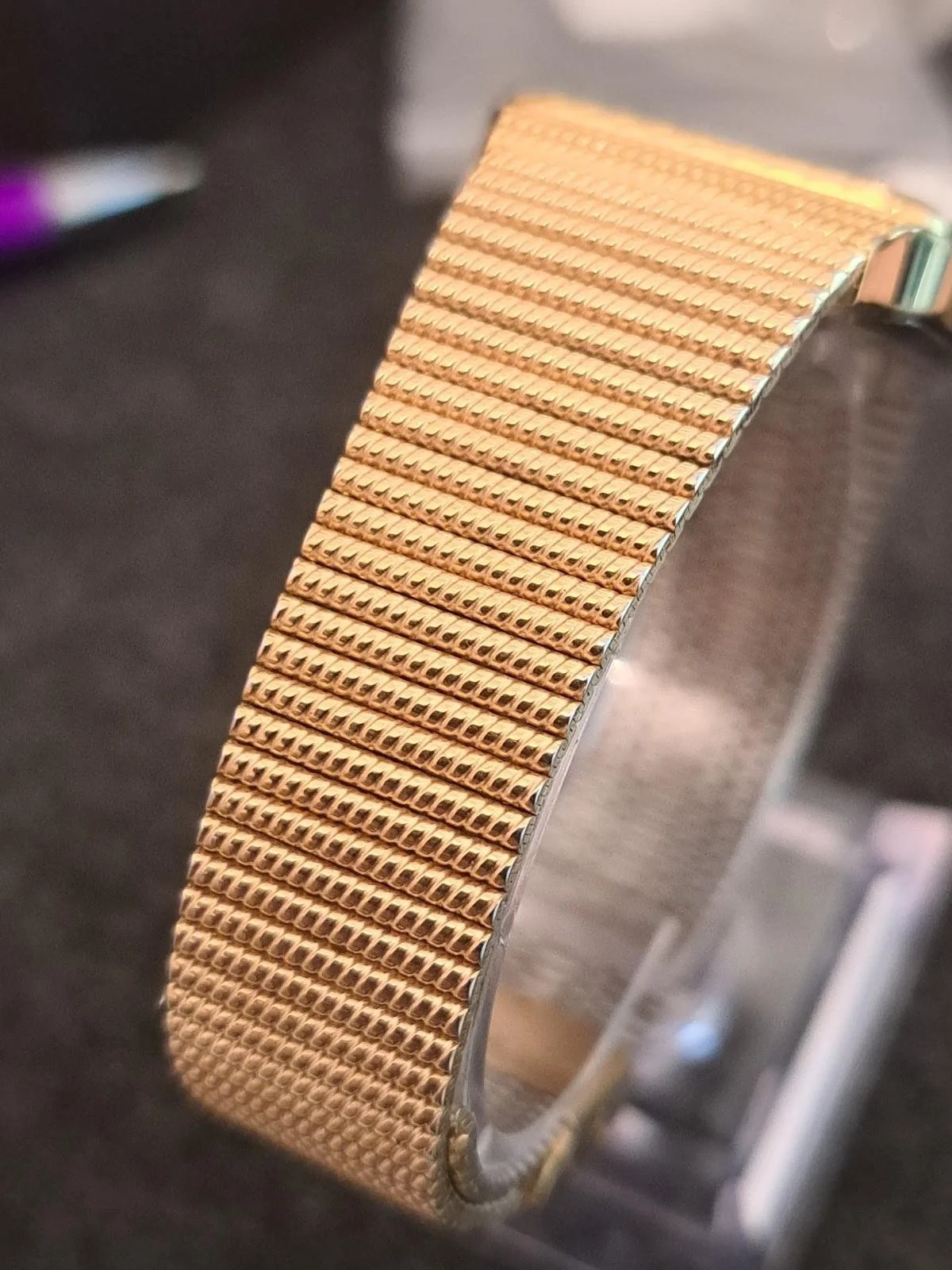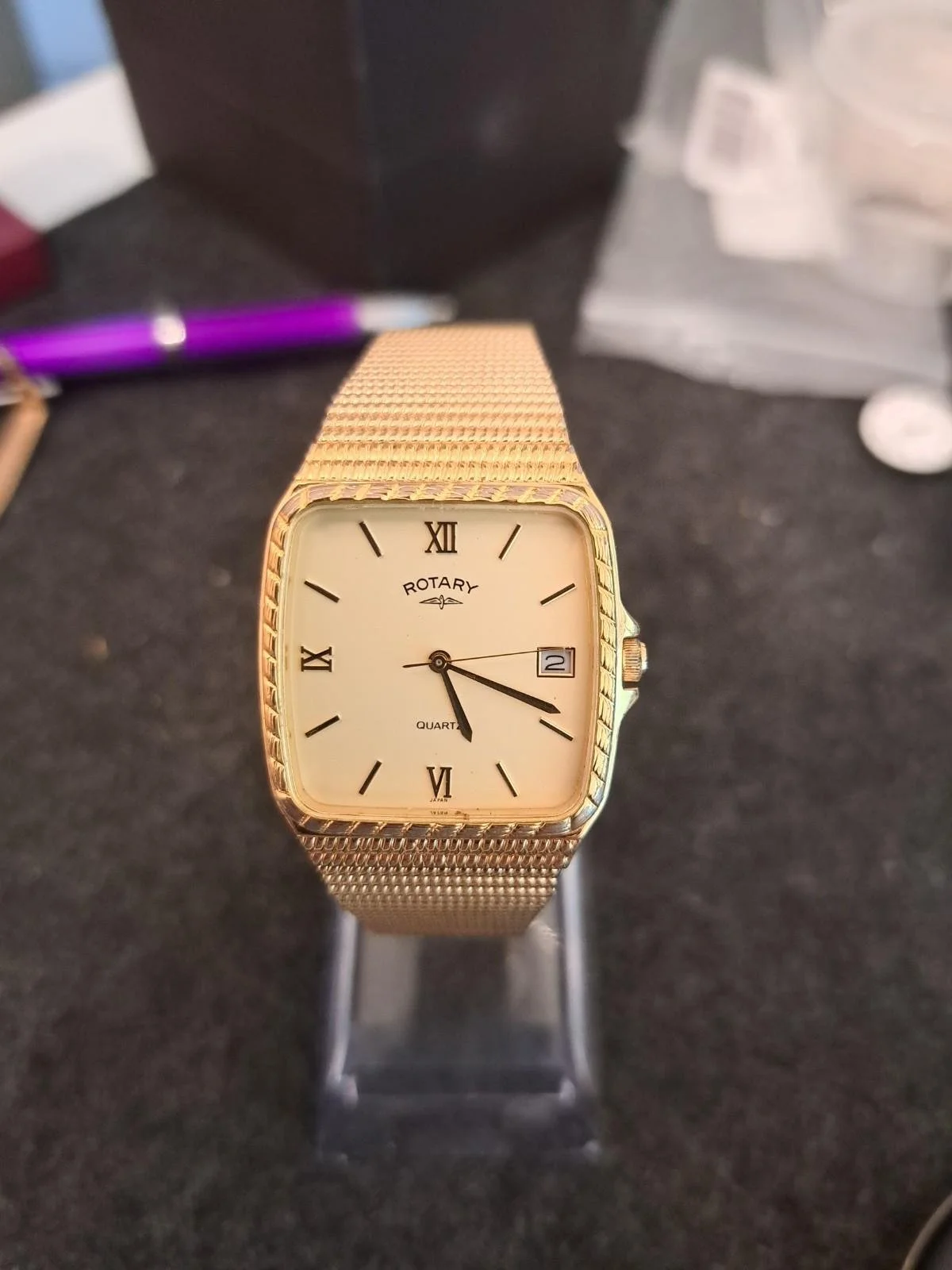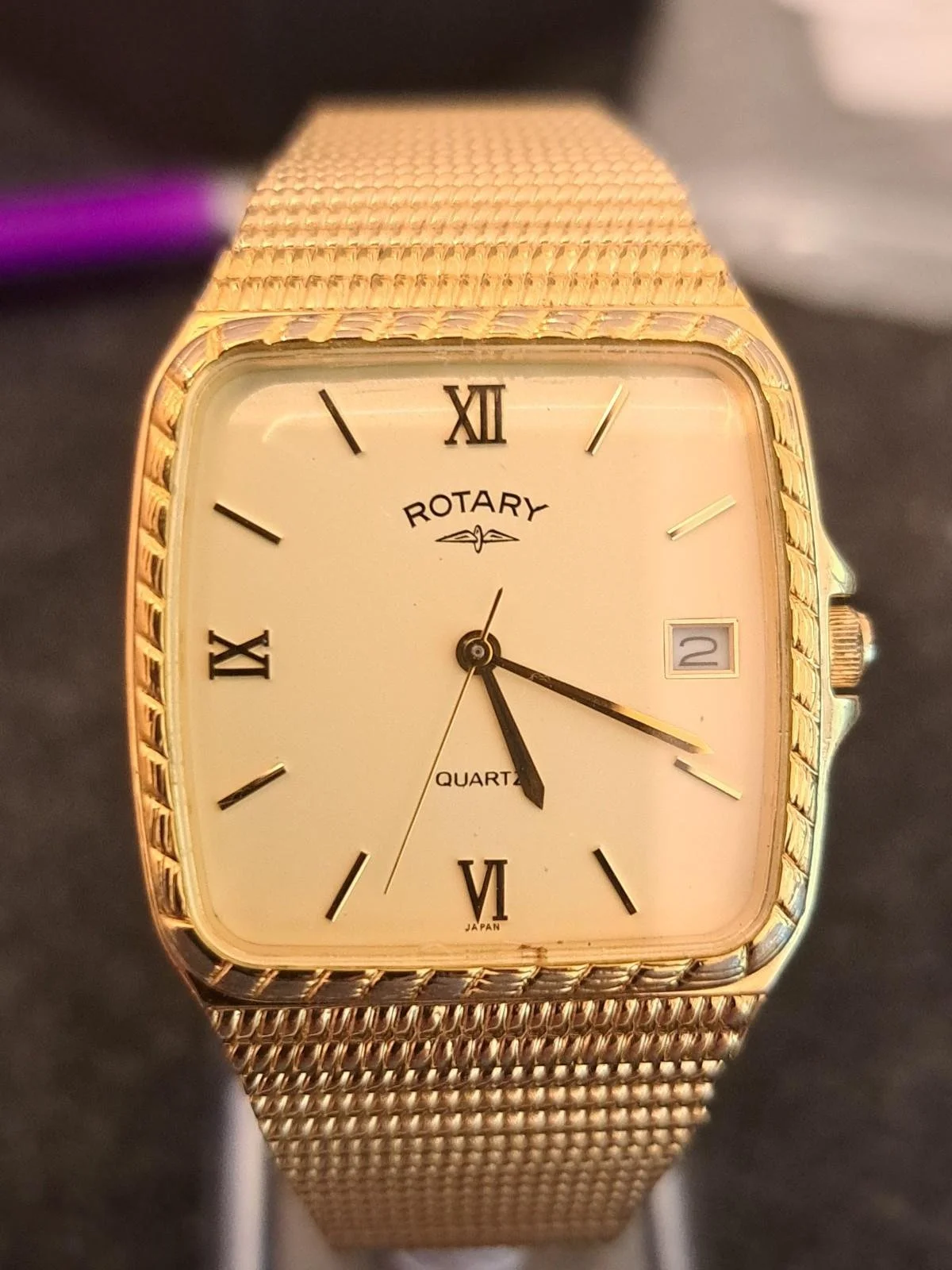 stylish and classic timepiece from Rotary, featuring a rectangular gold-tone (plated) case and matching metal bracelet. Runs on a reliable quartz movement (Japan) with date window. Highlights: Brand: Rotary Case: Rectangular gold-tone plated metal Bracelet: Matching gold-tone mesh/metal, original Rotary clasp Movement: Quartz (Japan) keeps excellent time Dial: Champagne/cream tone (or as per photo) with Roman numerals & hour indices (if applicable) Condition: Fully working, minor cosmetic marks from normal wear (please inspect photos) Size: [If you have case width/height please include, e.g. Approx 28mm x 30mm excluding crown] Water Resistance: (if marked) or state not guaranteed for water use if no marking What you get: The watch as shown Ready to wear, new battery just installed (or battery condition if youve done so) Notes: This is a smart everyday dress watch with classic charm. Not solid gold gold tone/plated finish so value reflects that. Bracelet shows light signs of wear consistent with use.