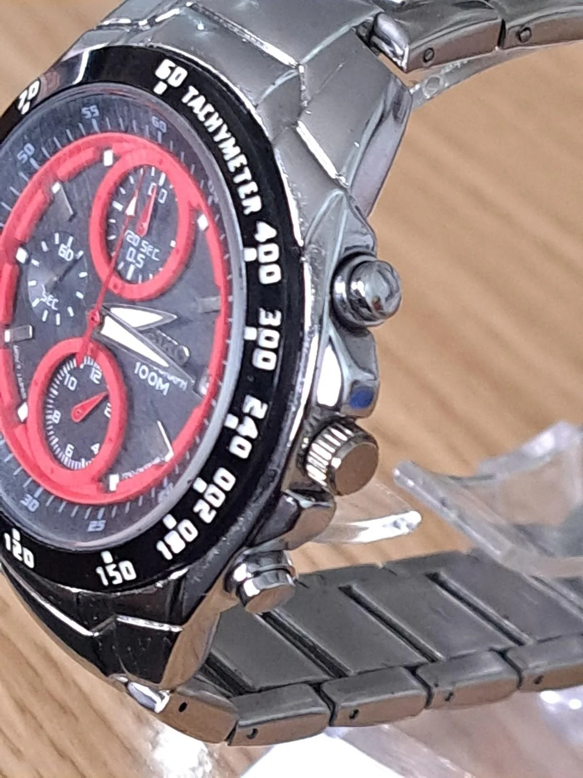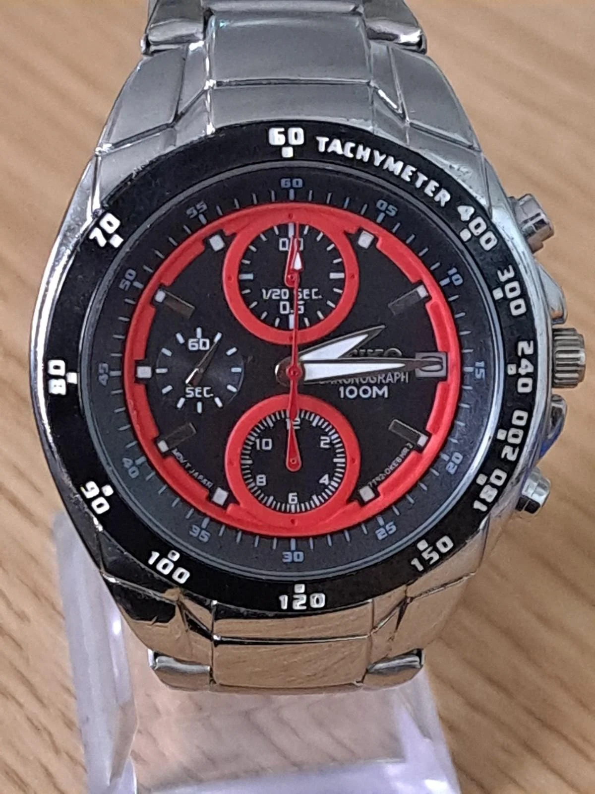 A striking Seiko chronograph featuring the desirable red and black racing-style dial , tachymeter bezel and stainless steel case and bracelet. This model uses the reliable Seiko 7T92 quartz chronograph movement , known for its durability and accuracy.