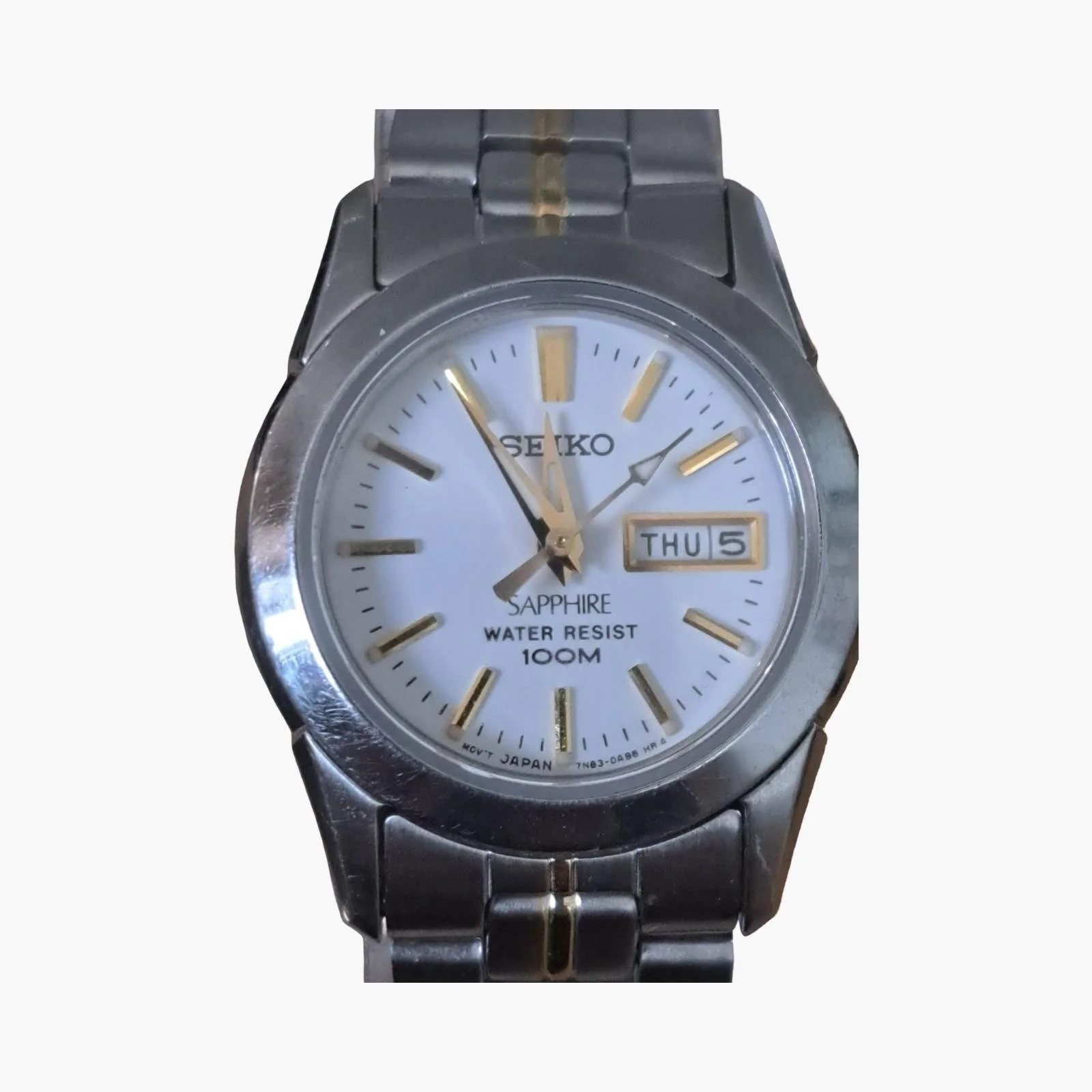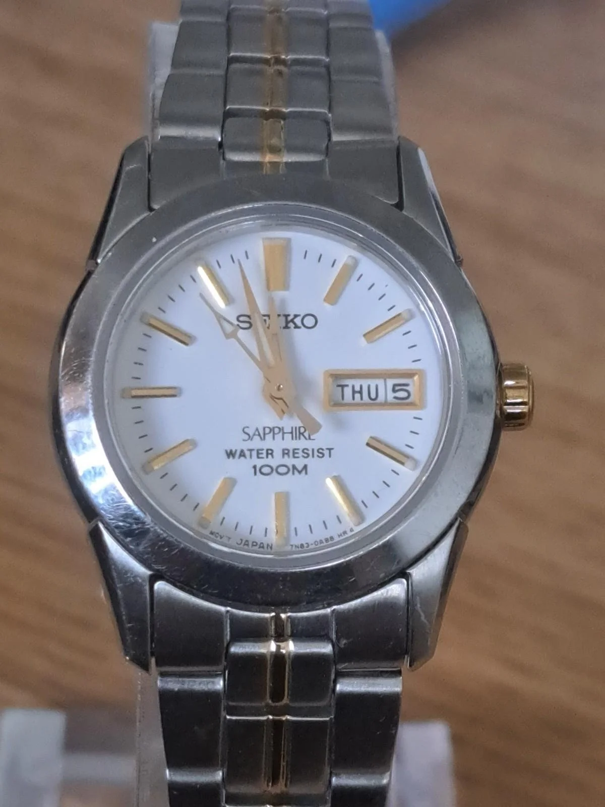 Seiko Ladies Two Tone Watch 7N83-0A40 Day Date Sapphire 100m Quartz Working
