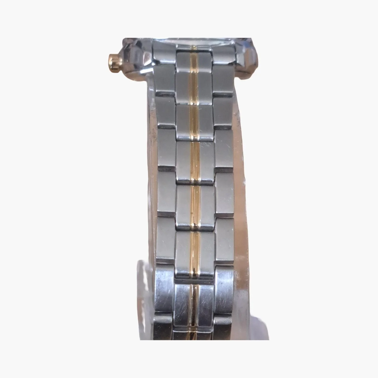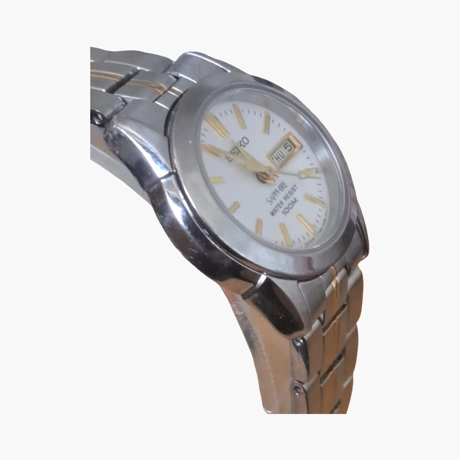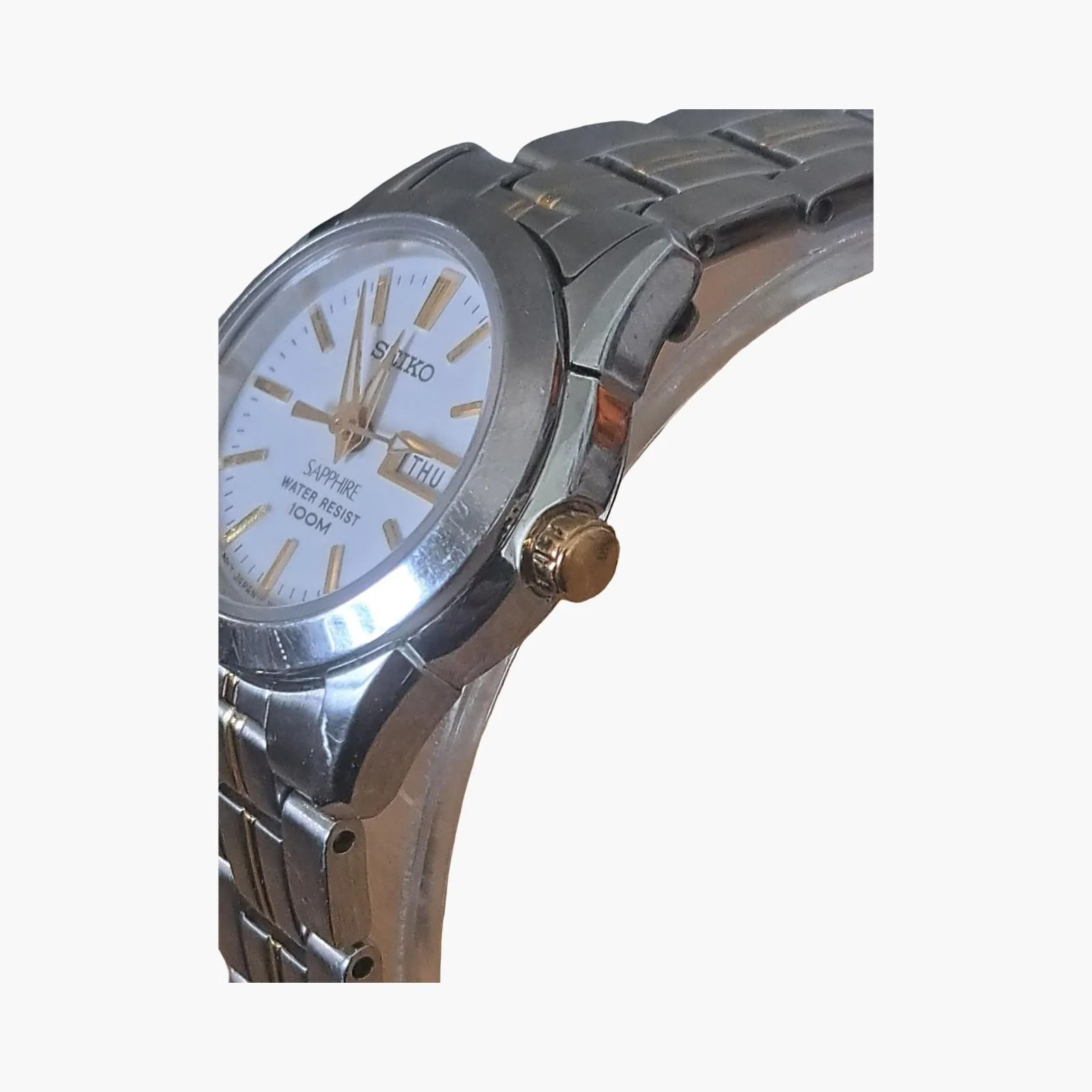 Elegant Seiko ladies quartz wristwatch featuring a classic two-tone stainless steel case and bracelet with a clean white dial and gold tone hour markers.