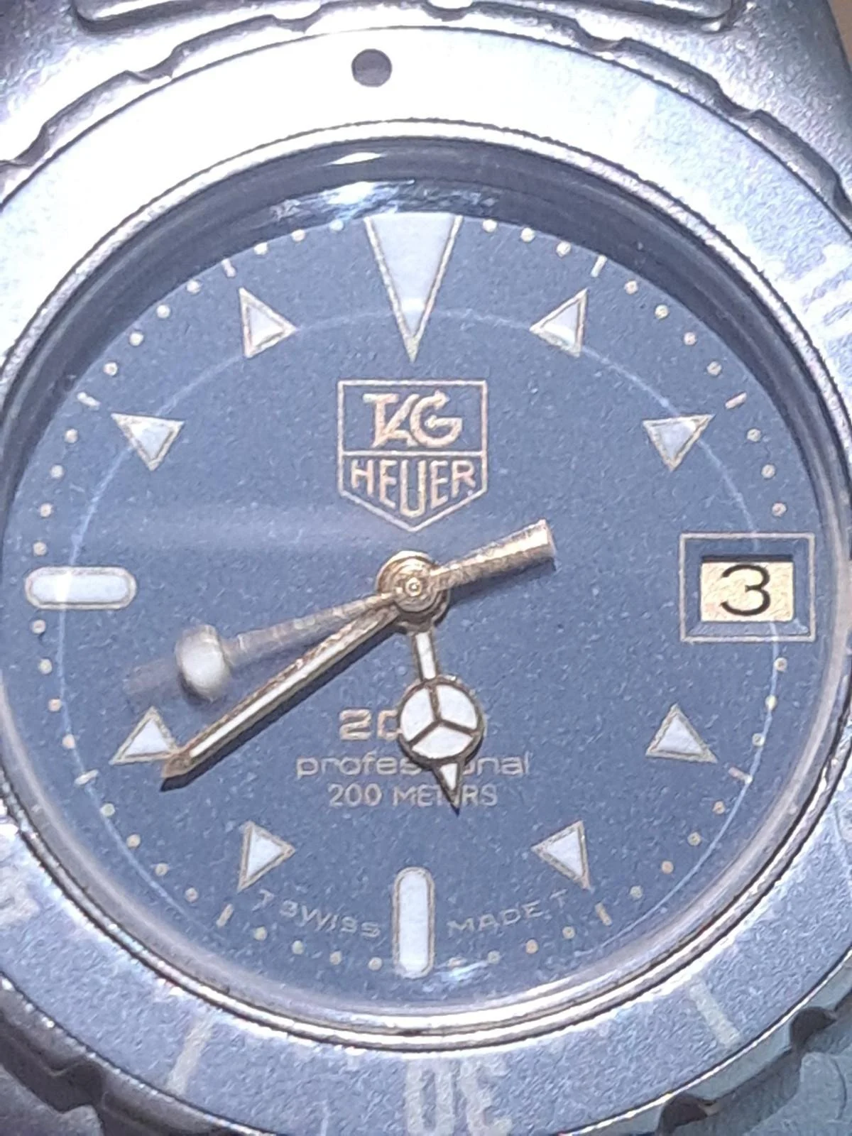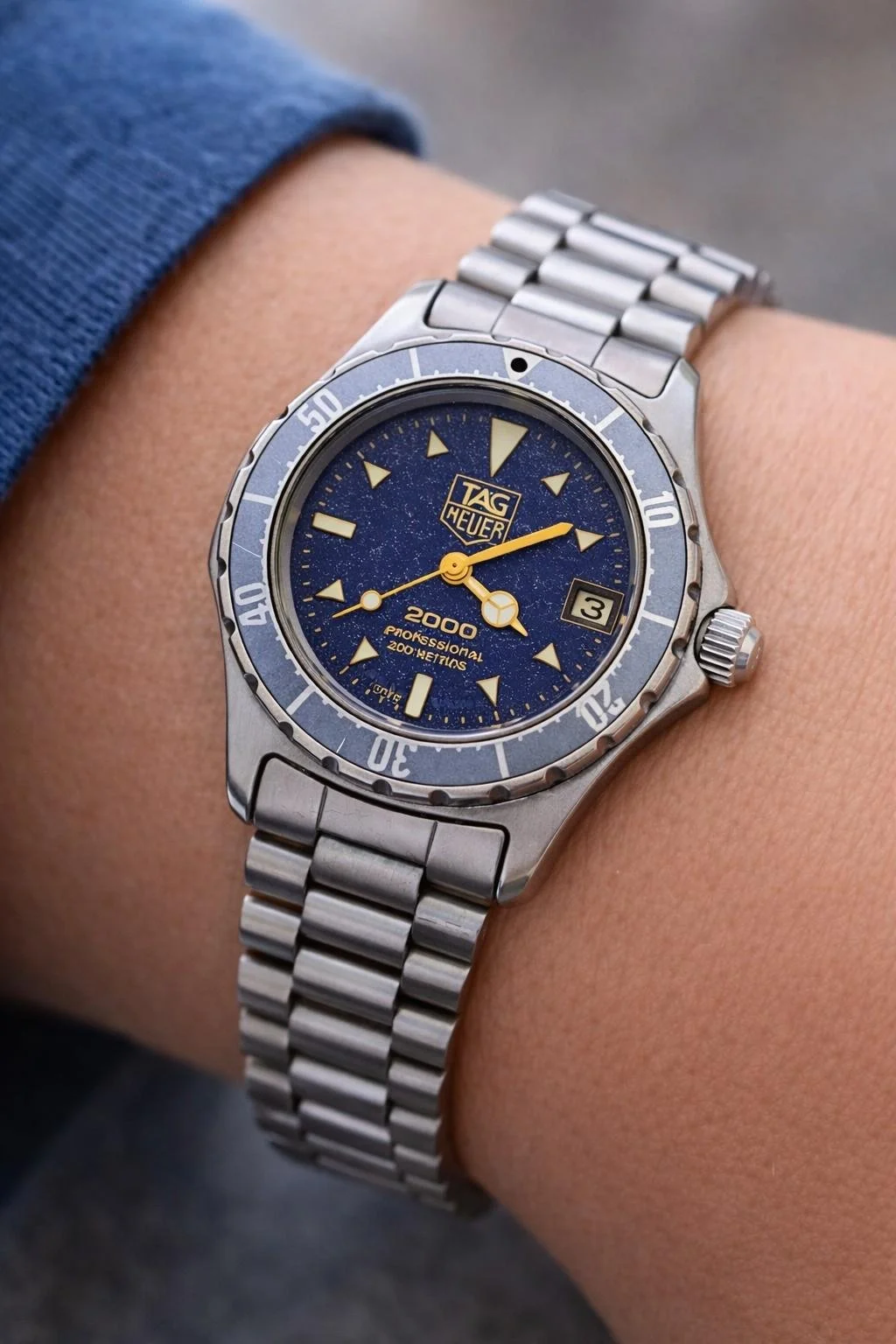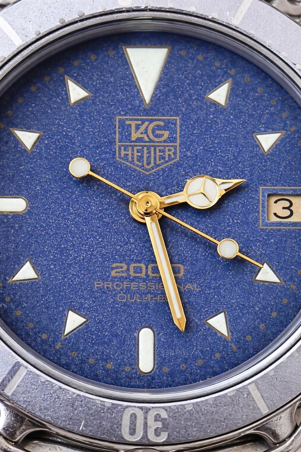 TAG Heuer 2000 Professional Ref. 972.613 featuring the desirable navy blue textured dial with gold Mercedes-style handset and date display.