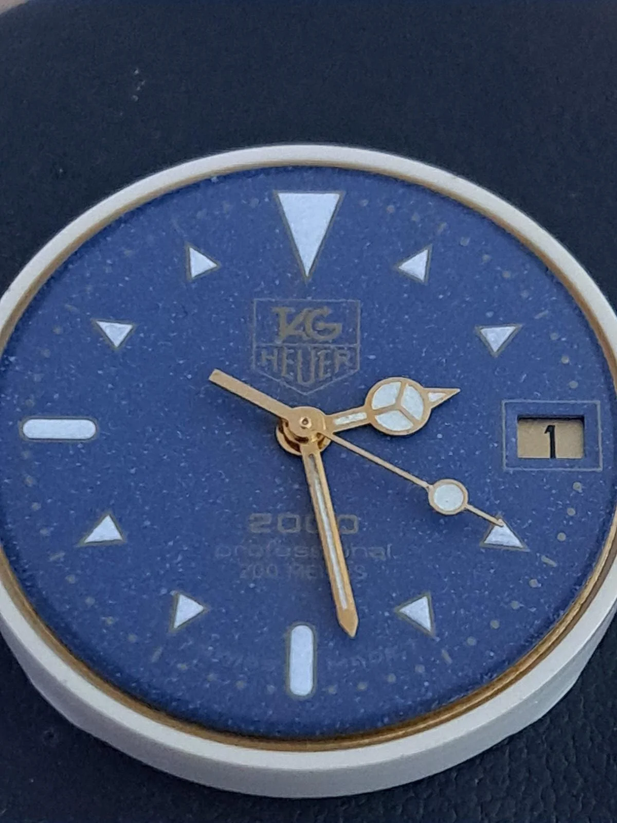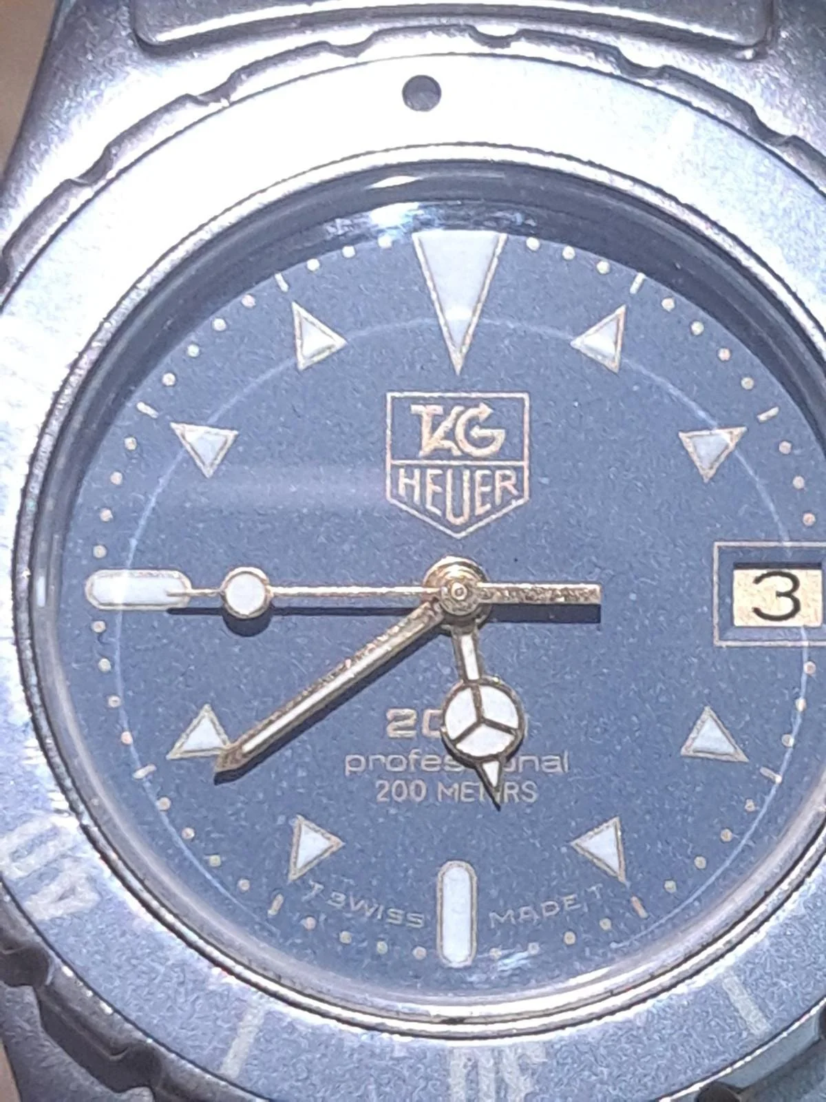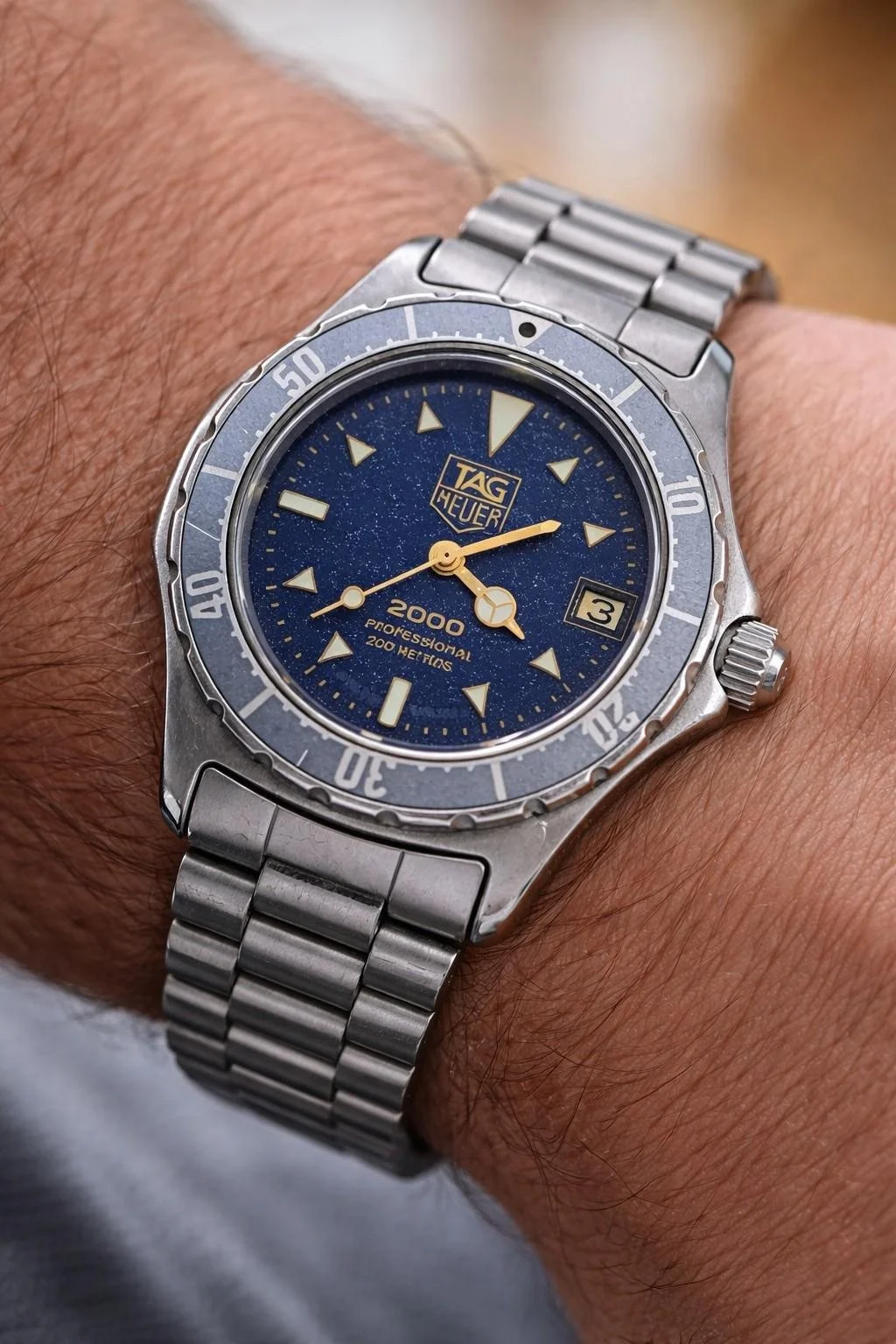 TAG Heuer 2000 Professional Ref. 972.613 featuring the desirable navy blue textured dial with gold Mercedes-style handset and date display.